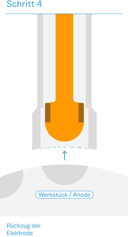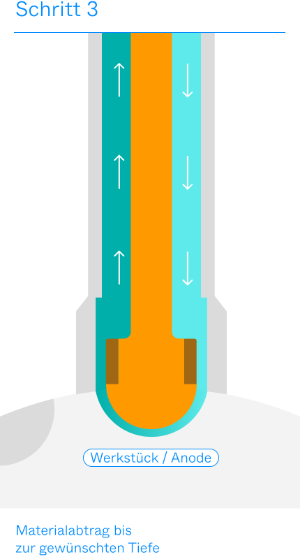 Das Werkstück (Anode) und die Werkzeugelektrode (Kathode) werden an eine Gleichstromquelle angeschlossen. Eine spezielle Elektrolytlösung schließt den Stromkreis, trägt Metallionen ab und verhindert mechanischen Verschleiß. Durch das Vorschieben der Werkzeugelektrode entsteht die exakte Werkstückkontur – ideal für komplexe Geometrien.